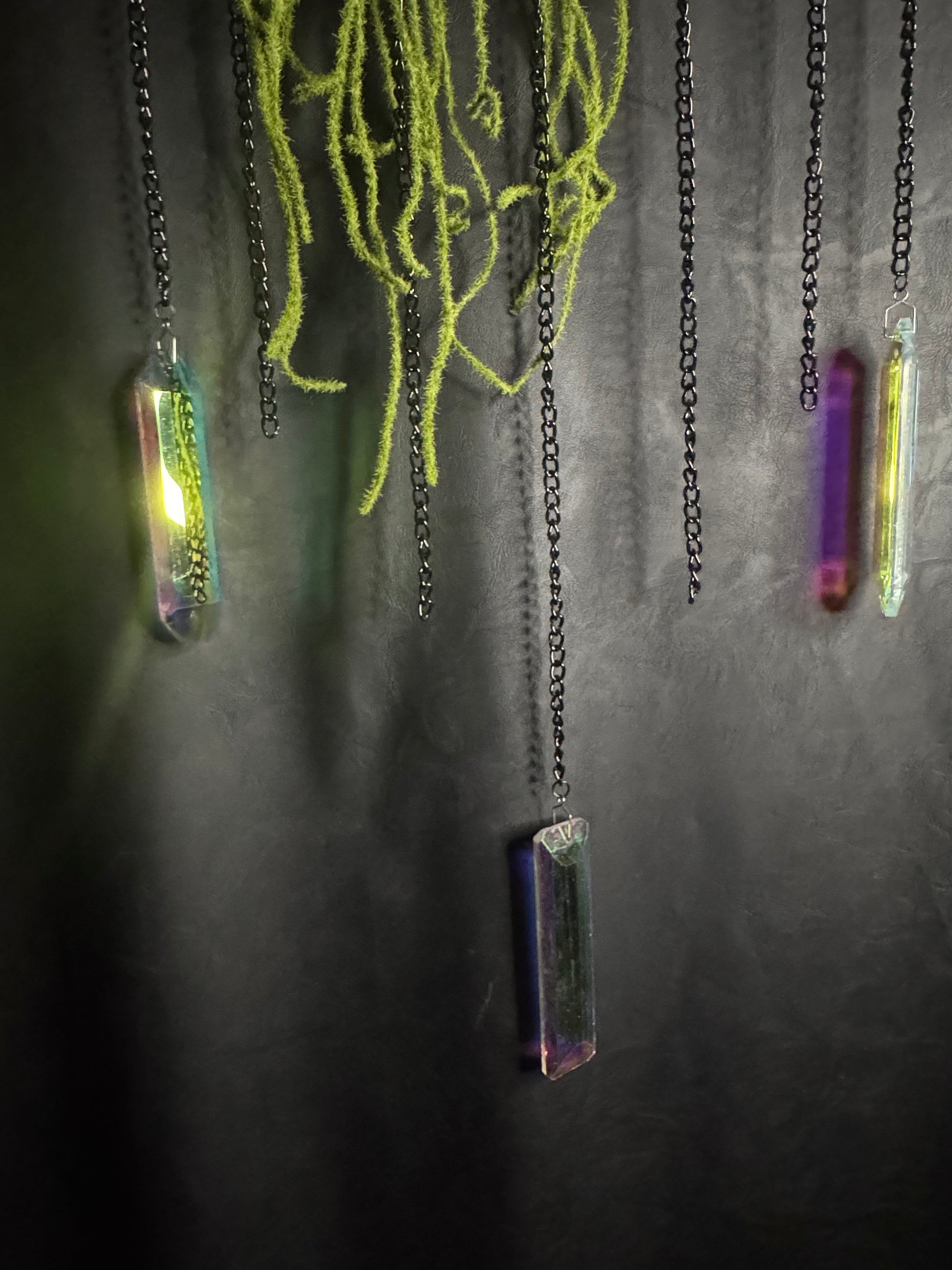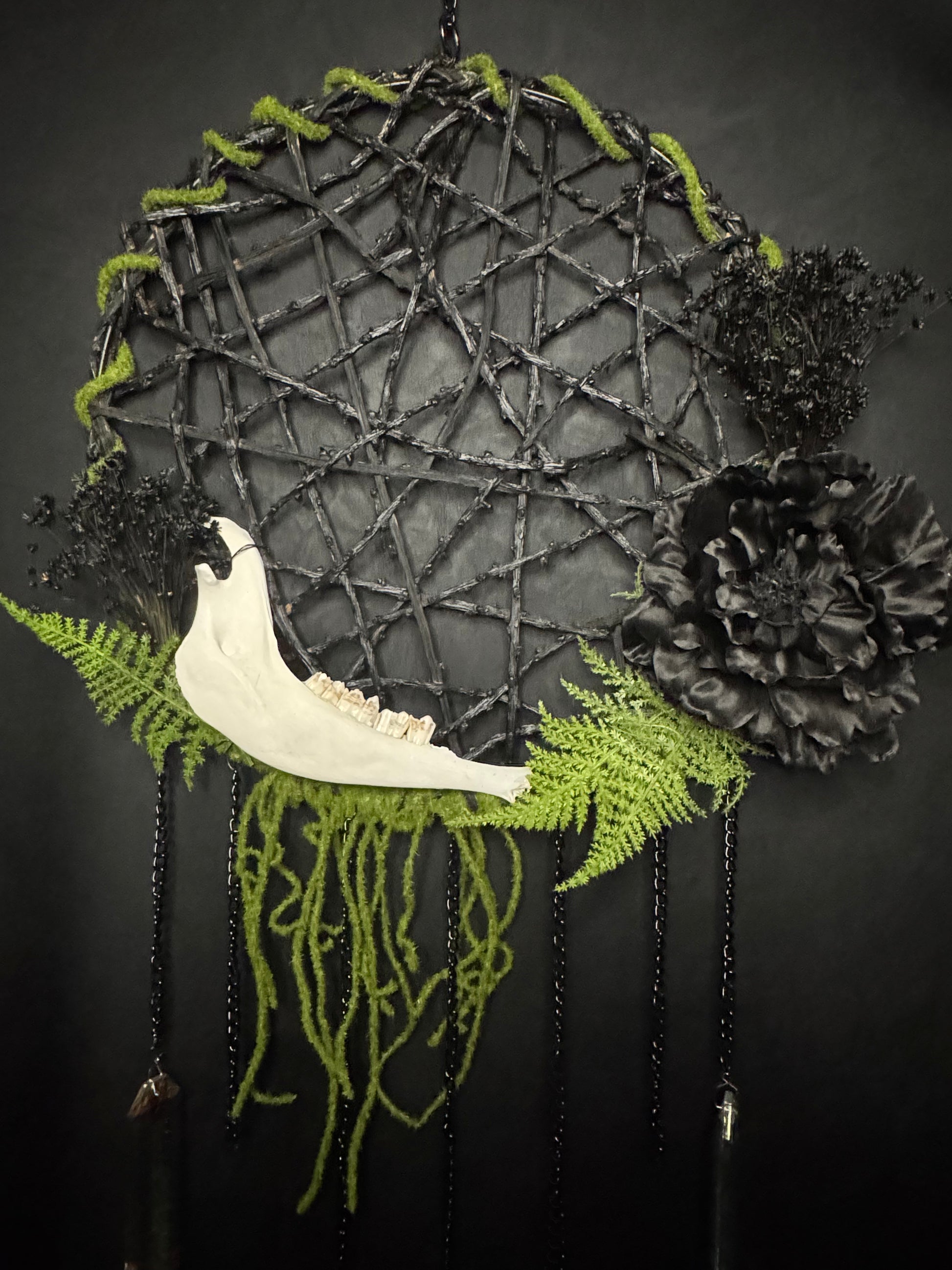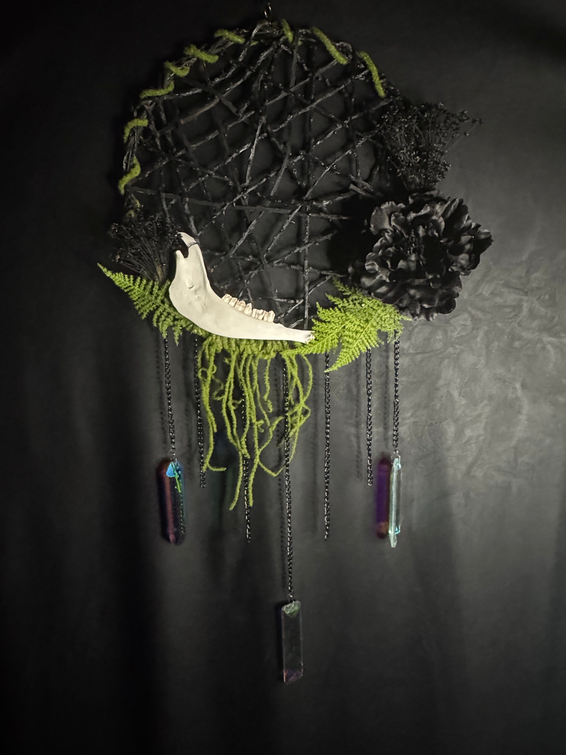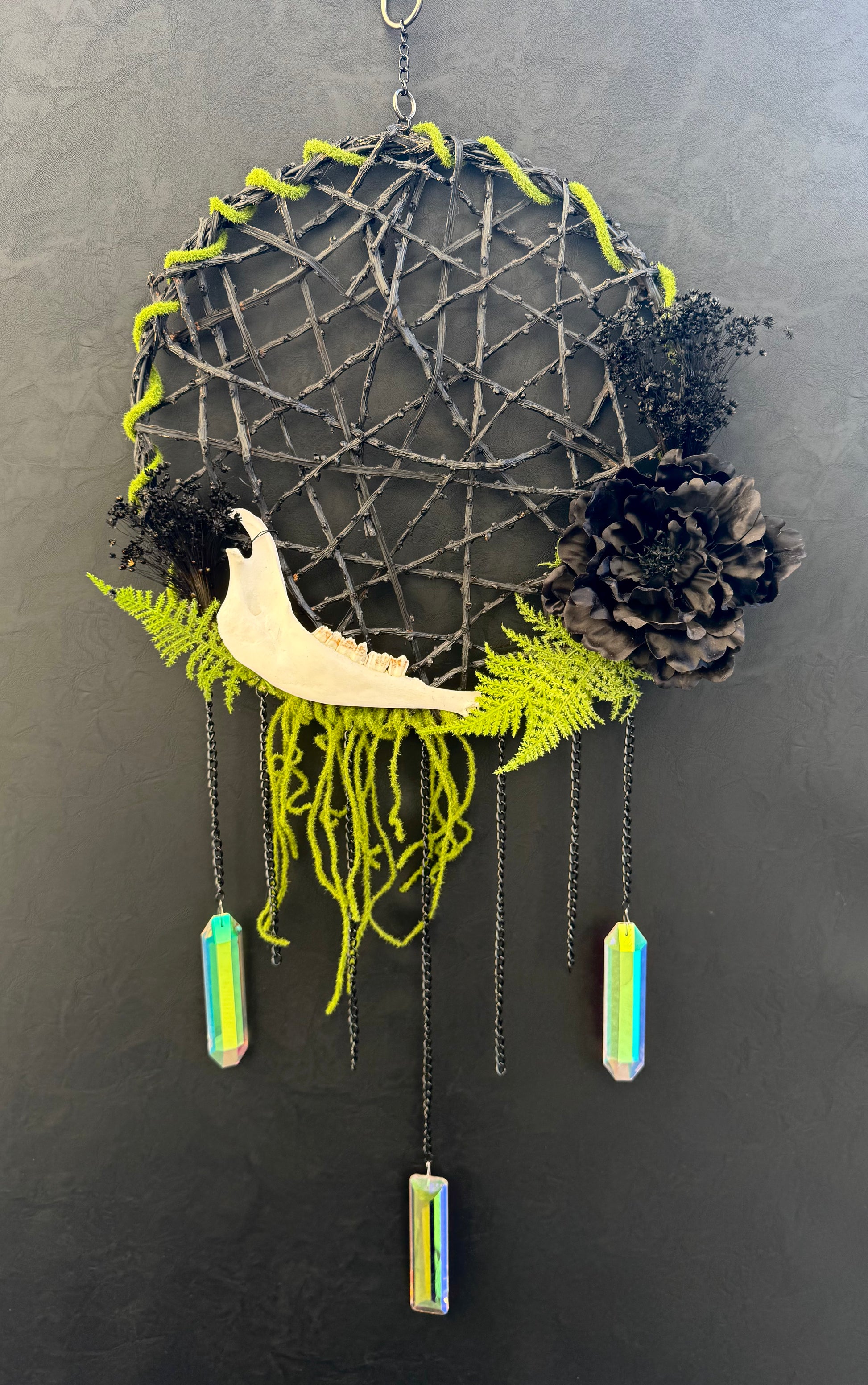 Large Dream Catcher with an organic wooden base featuring a large animal jawbone (assumingely sheep or deer), dried flowers, silk flowers, chains, and 3 sun catching rainbow prisms.