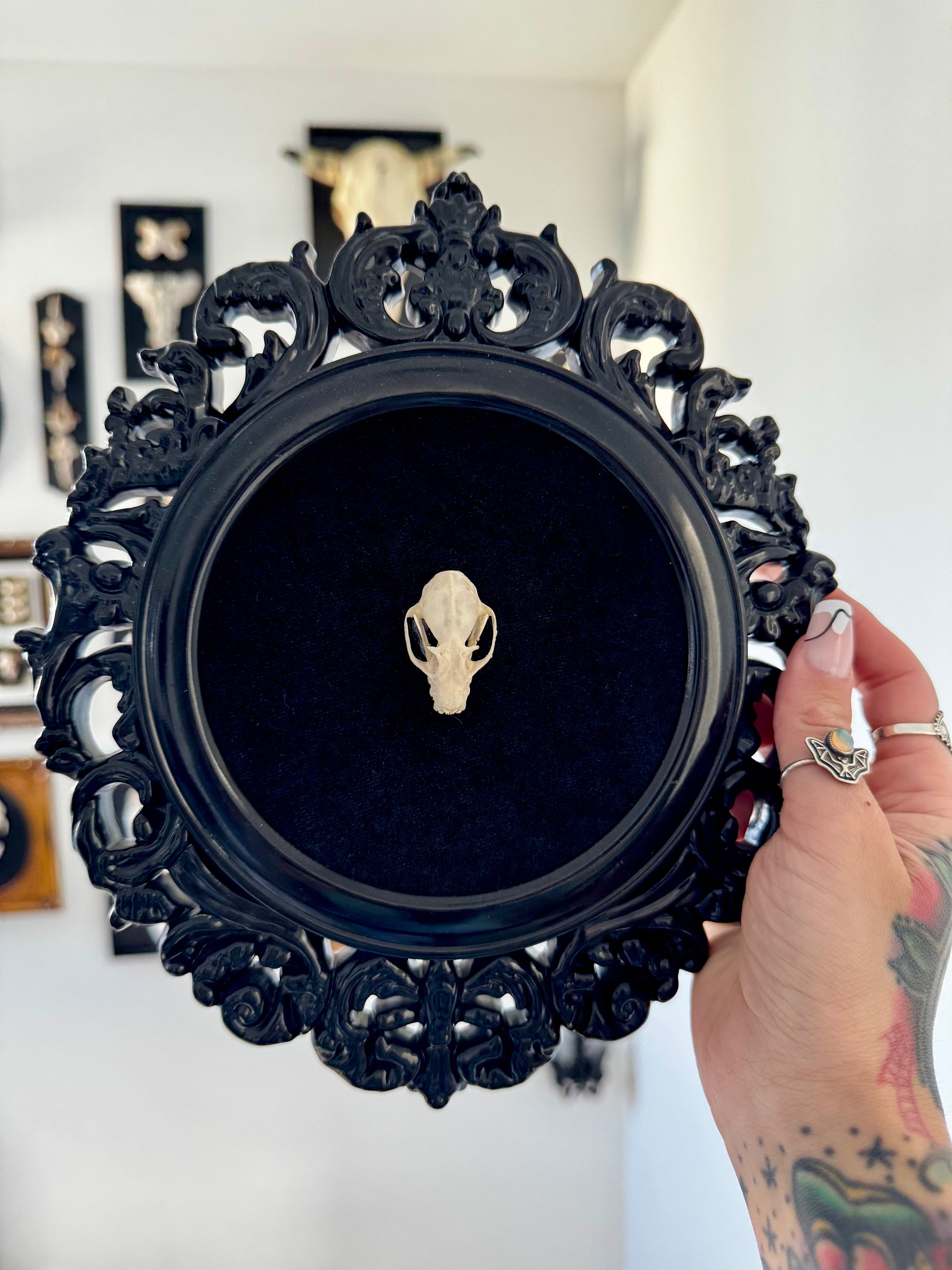 This bat skull has been mounted on a velvet lined, black acrylic frame. It is super lightweight and ready to hang.