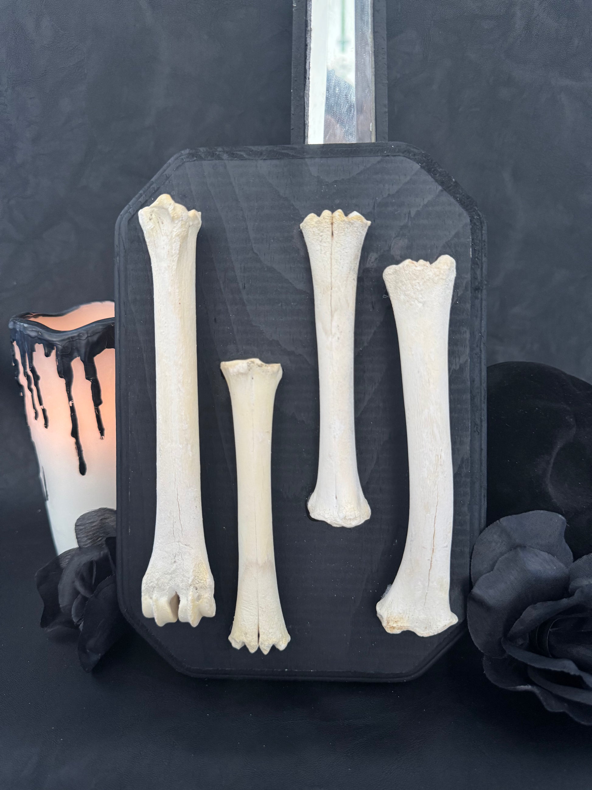 Four leg bones (presumably from a sheep) mounted on a ~ 9" x 6" plaque