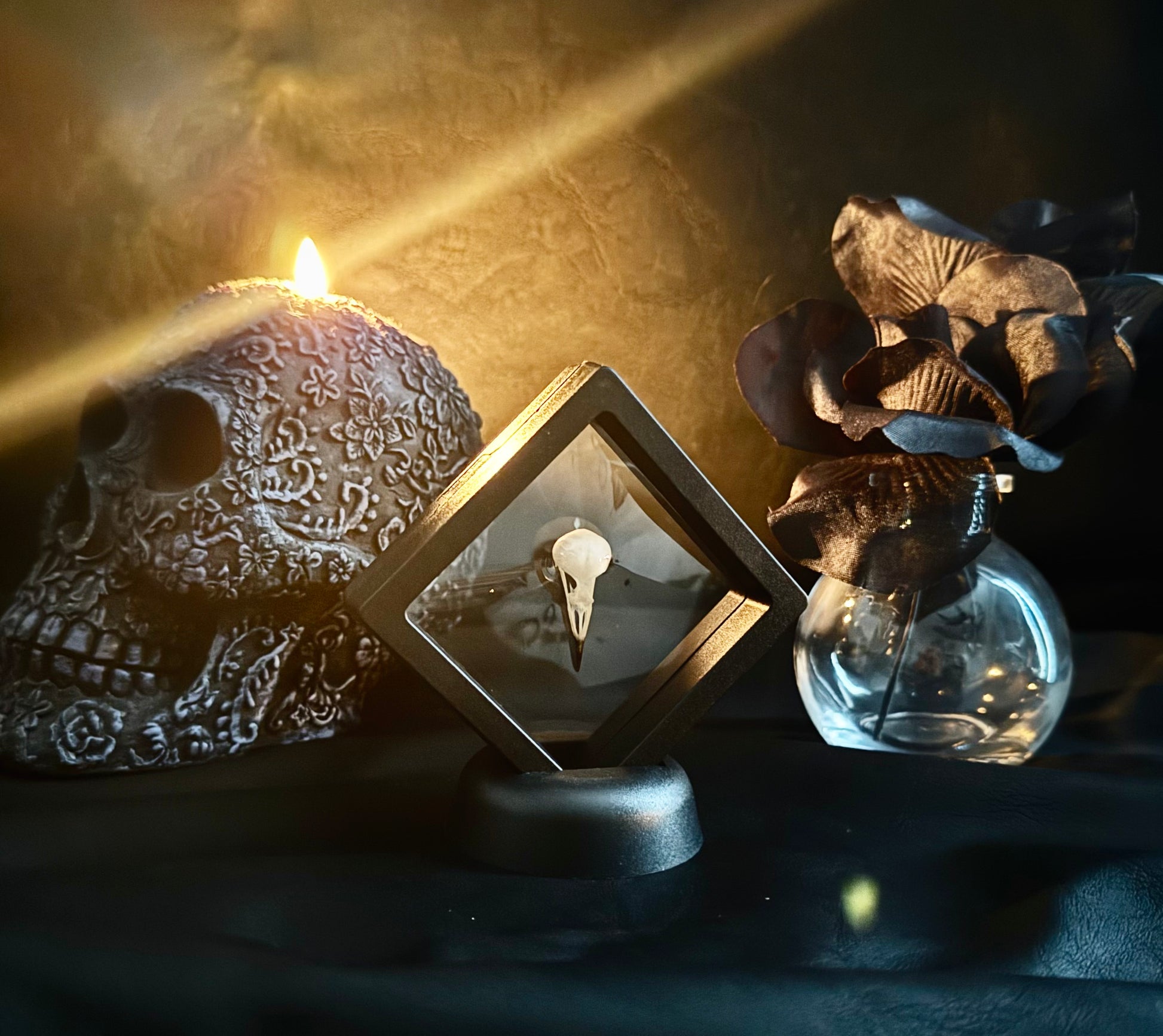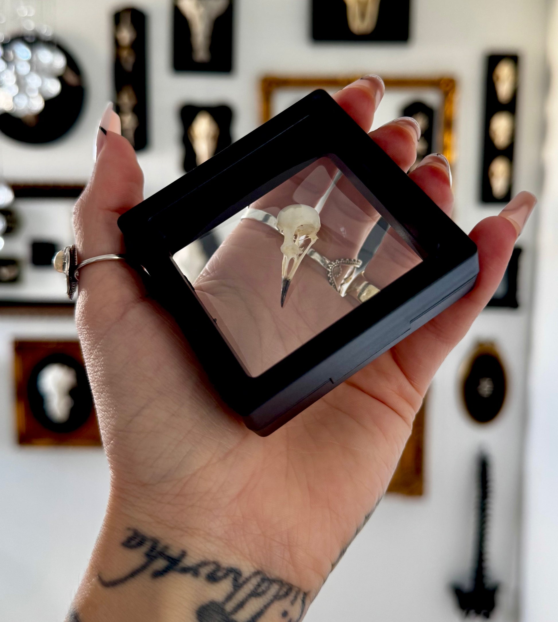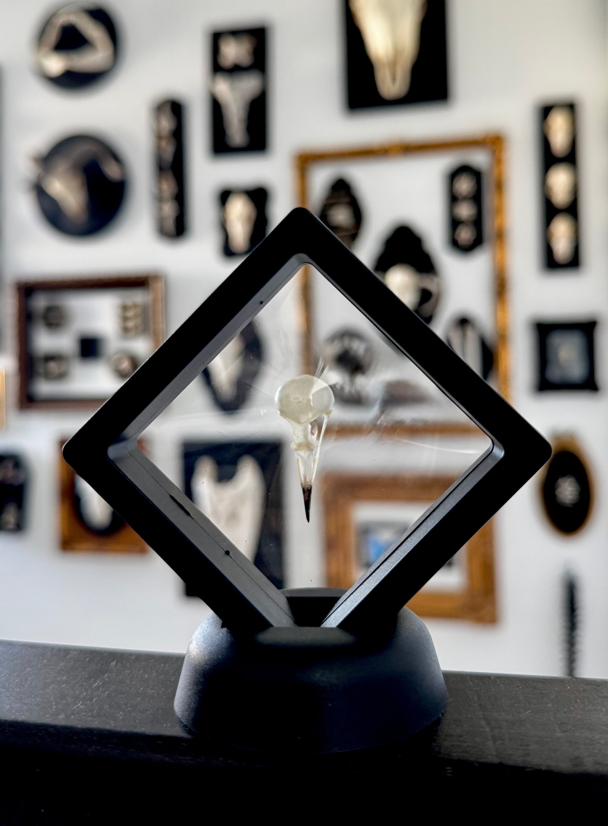 This small Avian skull is displayed in a 2.75in floating frame, stand included.