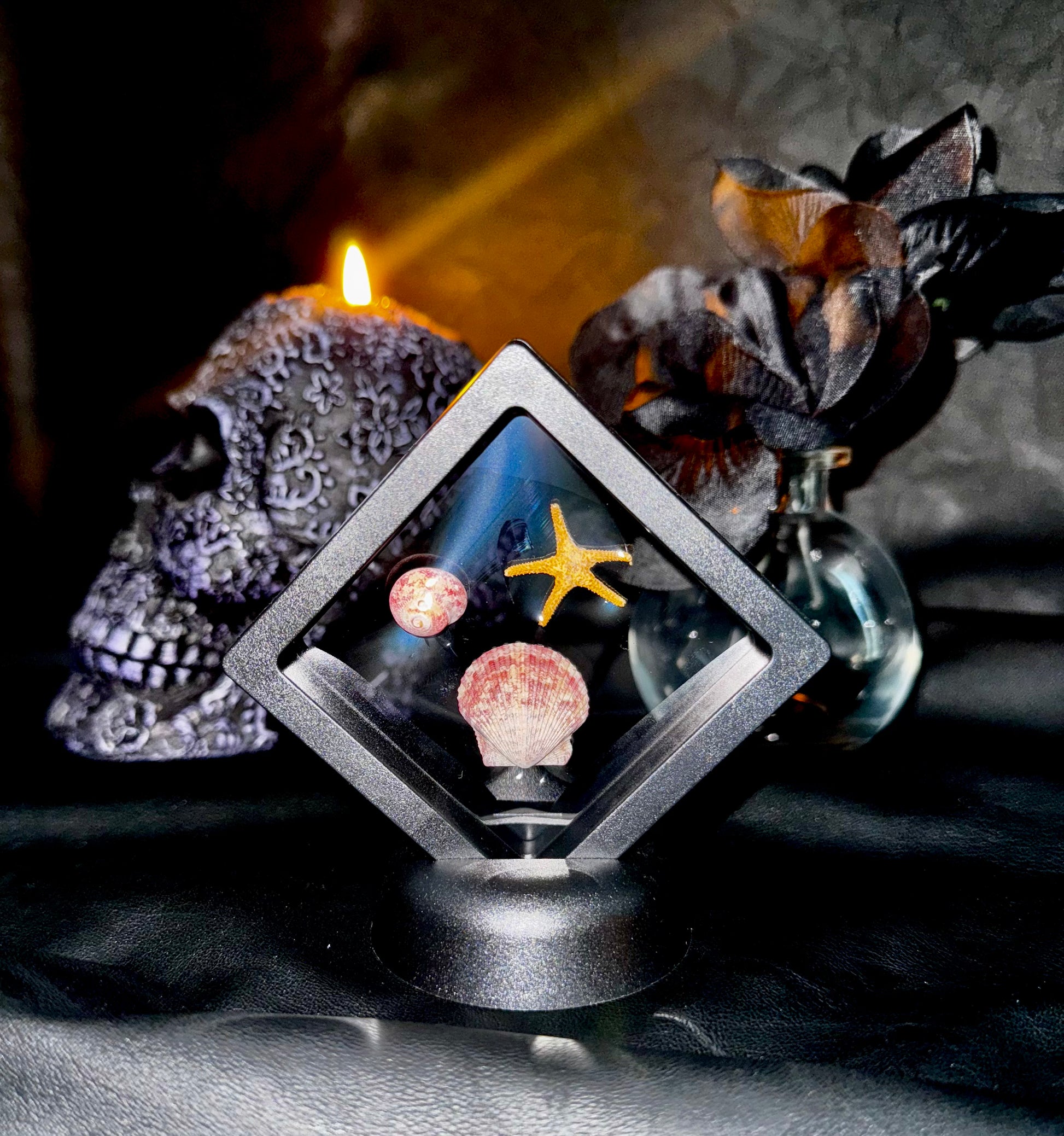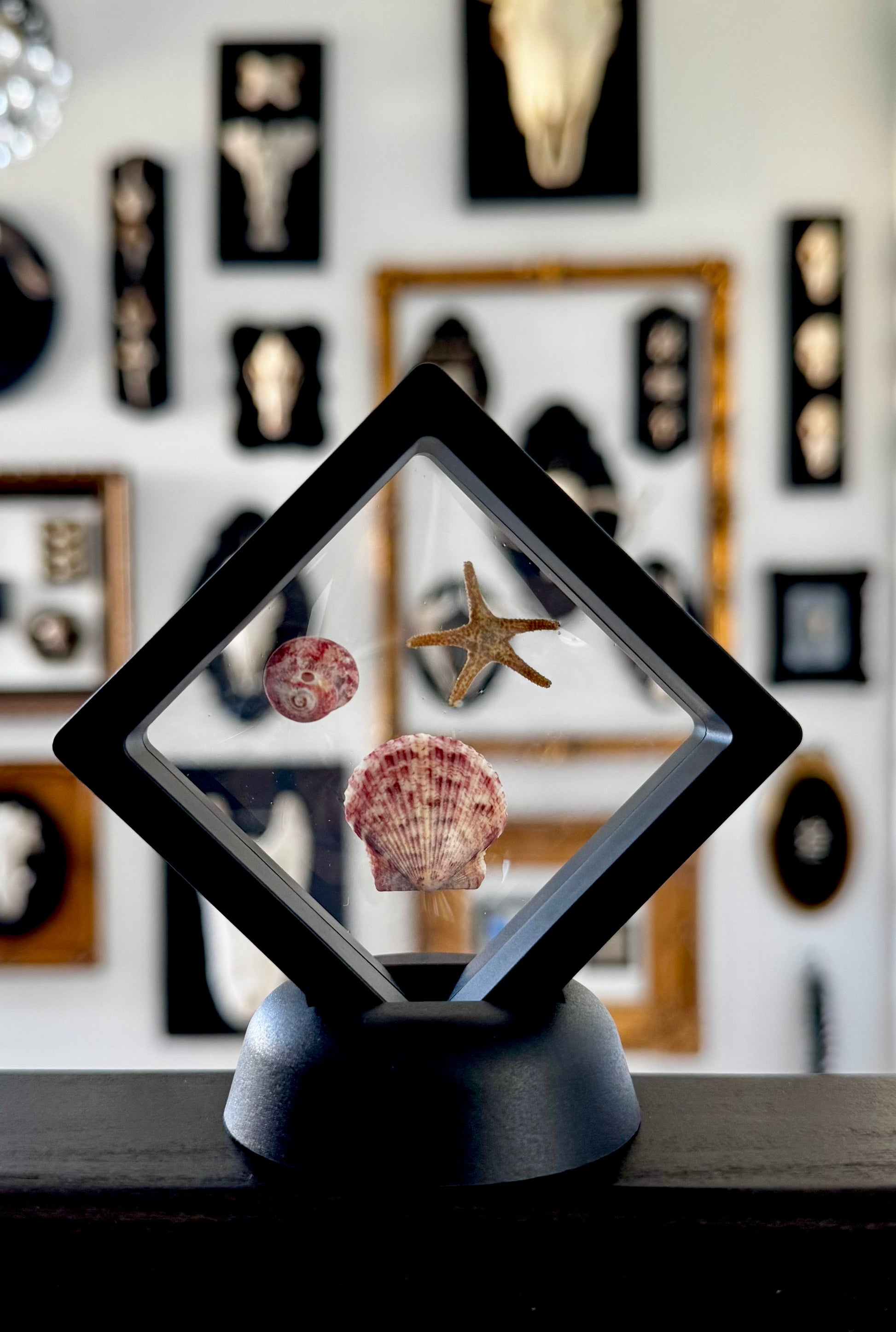 This 2.75in floating frame features a small starfish and 2 teeny tiny shells, from the coast of Florida, stand included.