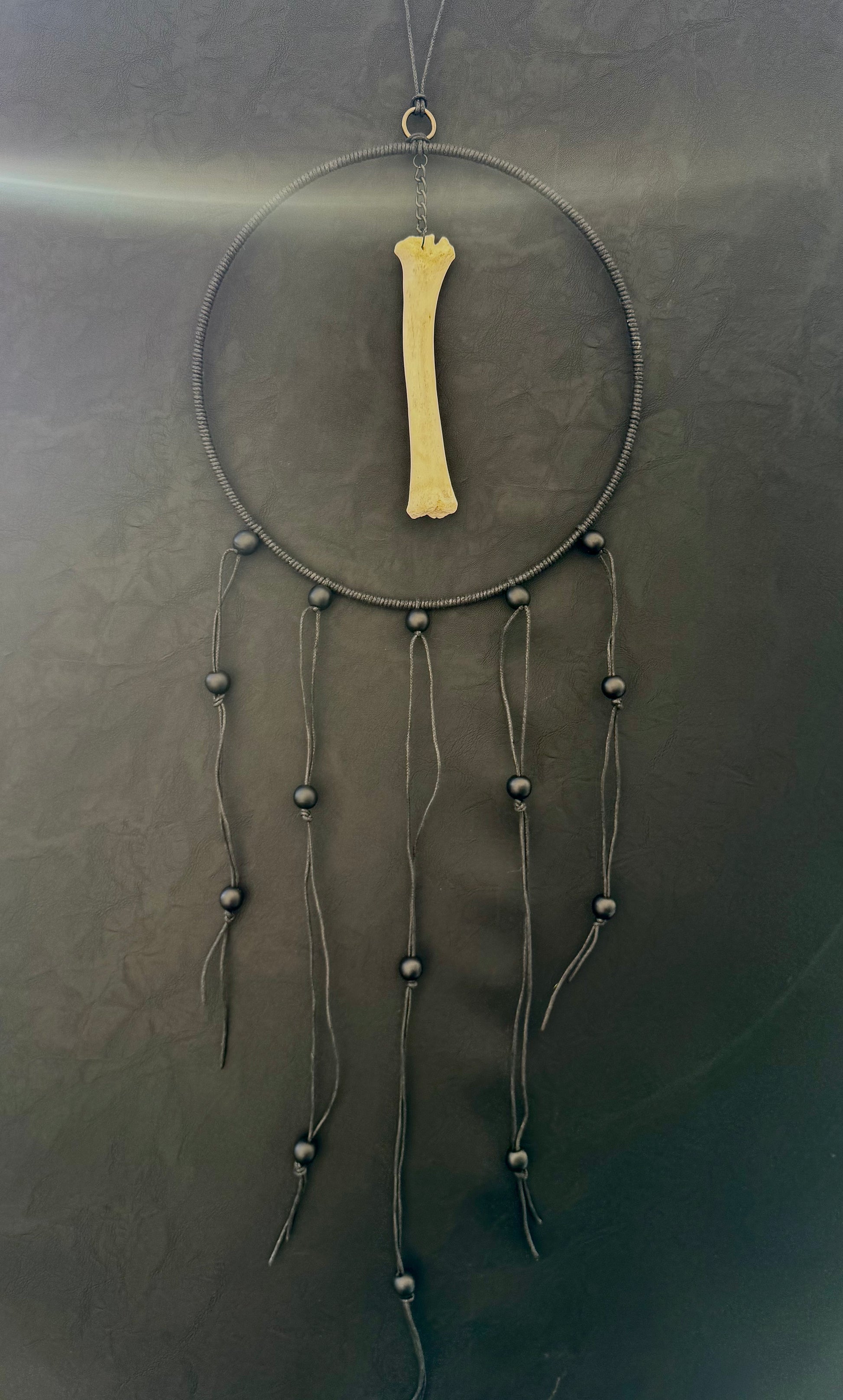 Hand wrapped with waxed cord, this dreamcatcher features an ethically sourced sheep long bone in the center, and wooden bead accents.